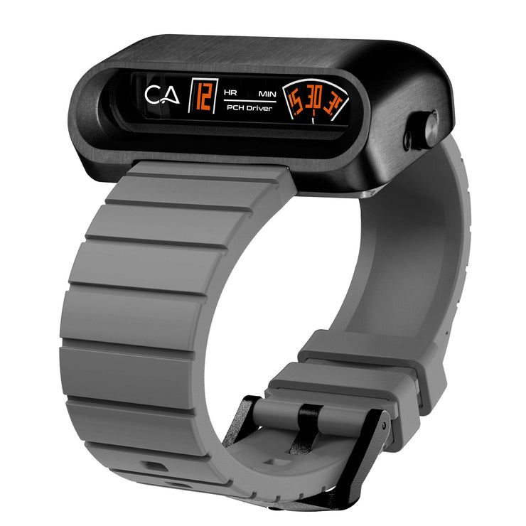 The PCH Driver is a nod to the driver's watches of the '70s. These designs allow you to read the time while your hand is on the steering wheel. The PCH utilizes a prism to reflect the hours and minutes from a flat surface up to the perpendicular angle for viewing. Using a micromotor gearbox, the hour jumps to the next hour when the minute disc reaches the 59-60 minute transition.