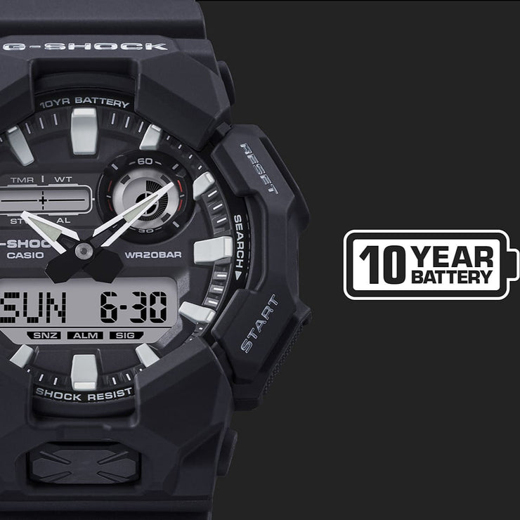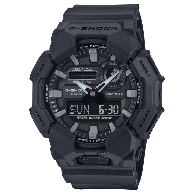 With a totally cool large-case G-SHOCK in black with a 10-year battery you won’t have to worry about for ages. The analog-digital GA-010 offer handy features like world time and stopwatch, with a large, easy to read display and large case. The front button makes it simple to access the high-brightness LED light so you can easily read the dial, even in the dark. Made with bio-based resin and equipped with a 10-year battery, this G-SHOCK is designed to be good for the environment — and good for fashion. These black design move with ease from casual styling to work setting.