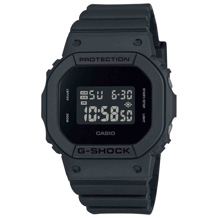 Street-smart and nature-minded — a fashionable G-SHOCK dressed in all black. The monochromatic design with a matte finish makes for a simple, yet bold design. Key resin components of the bezel and band are made with bio-based resin. Produced using renewable organic resources, this material is expected to help reduce environmental impact. Choose your favorite all-black timepiece — the GMD-S5600, a smaller, slimmer version of the iconic G-SHOCK design, or the ever-popular GMA-P2100 analog-digital combination.