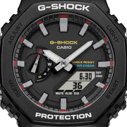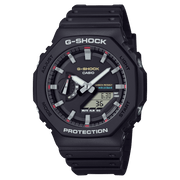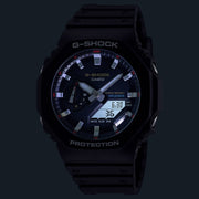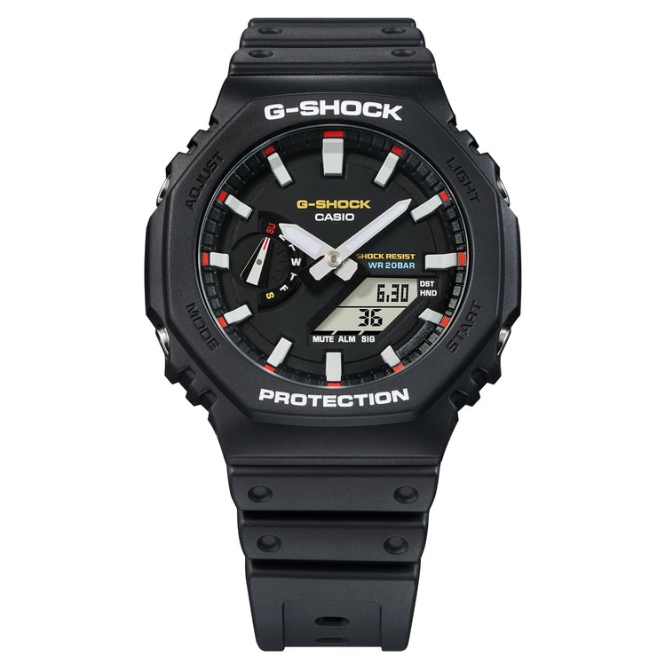 A simple and streamlined watch with octagonal bezel. The original color scheme is faithfully reproduced with touches of G-SHOCK red, representing the passion to take on challenges; blue, symbolizing excellent water resistance; and yellow, signifying outstanding shock resistance.