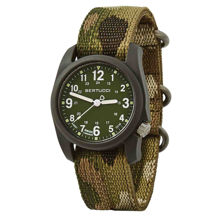 The DX3® Camo™ Series features our legendary U.S. Patented A-2 Unibody™ 40 mm fiber reinforced polycarbonate case. Equipped with authentic U.S. Military, Made in USA, 2-PLY camo webbing. The U.S. Patented band is made from a unique webbing construction that offers unmatched comfort and durability. Additionally, packed with performance features such as precise and reliable all-metal movement, 4 year battery life, 50 M water resistance, Swiss super luminous hands & markers, solid stainless steel crown, case back and band hardware, and scratch resistant R-Type mineral glass crystal.