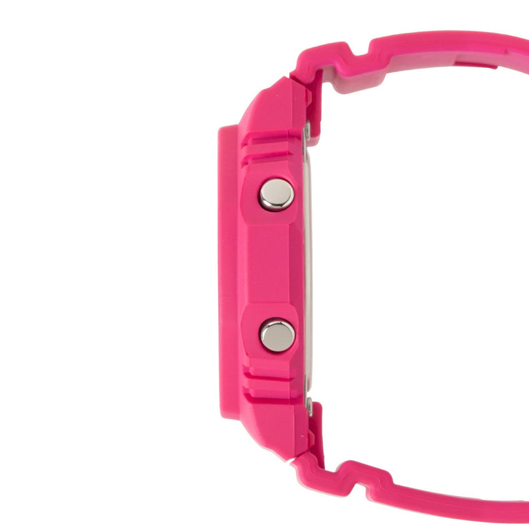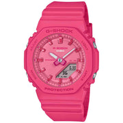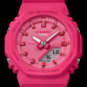 Empower yourself with pink. This powerfully pink lineup features stylish, monochromatic, subtly nuanced designs that exude individuality. No sticky sweet pinks here, just high-impact strength. The octagonal bezel and vivid mid-range pink come together for a stylish, fashionable look. Hands and indexes finished in metallic vapor deposition add a sparkling touch to the monochromatic design. This watch adds vibrancy to any casual outfit. Key resin components used in the bezel, band, and more are made with bio-based resin, a material produced using renewable organic resources that is expected to help reduce environmental impact.