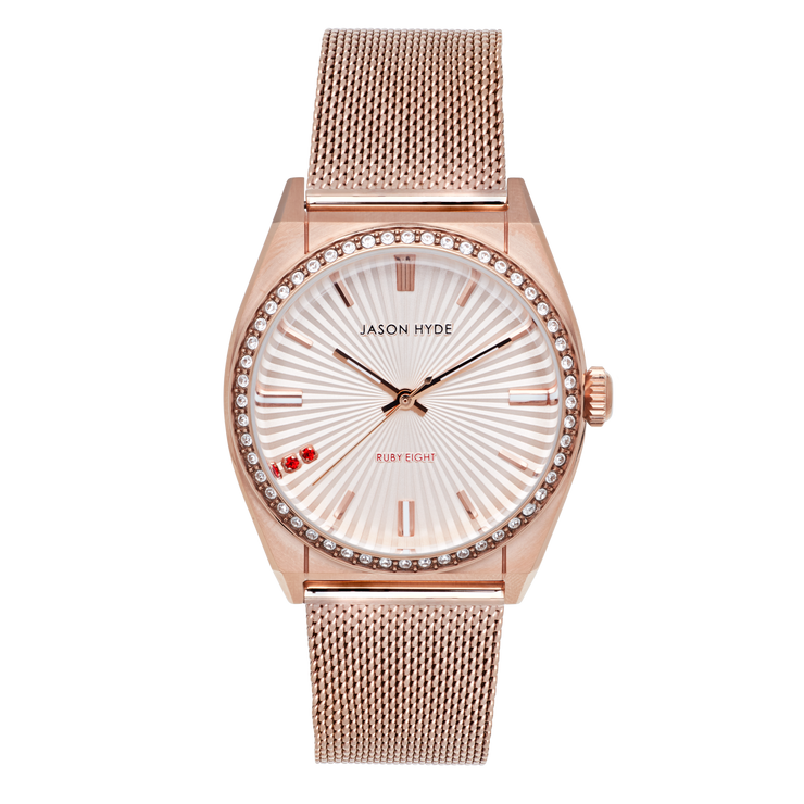 The Jason Hyde #RUBY-EIGHT 36MM Watch offers a radiant and sophisticated style with its elegant rose sunray dial and refined rose gold-toned mesh strap. Featuring a 36mm Stainless Steel case with a luxurious IP Rose Gold finish and subtle cubic zirconia accents, this timepiece exudes timeless elegance with a touch of sparkle. Powered by reliable Japanese movement and with a water resistance of 5 ATM (50 meters), it's perfect for adding a touch of subtle glamour to any occasion.
