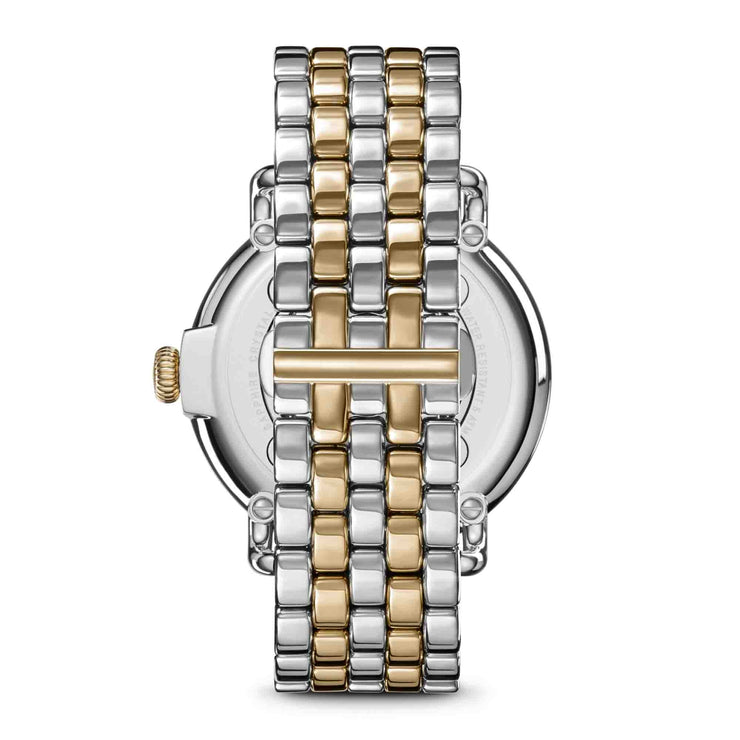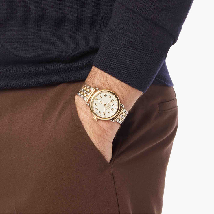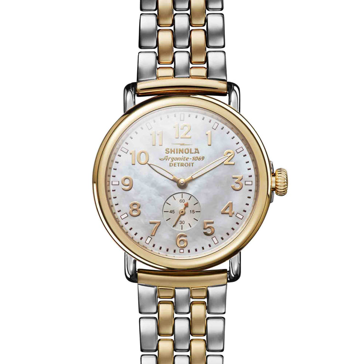 Built to last, named accordingly – The Runwell captures Shinola's commitment to classic design and quality construction. A truly feminine take on our flagship timepiece, this style features a stunning white mother of pearl dial, polished two-tone case, and two-tone stainless steel bracelet. A elevated and strong look for any wrist and every occasion.