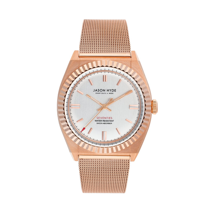 The Jason Hyde #UNO 40MM Watch offers a sleek and modern design with a sophisticated rose gold finish and reliable Japanese movement. Featuring a 40mm Stainless Steel case with a durable IP Rose Gold coating, this watch is both stylish and resilient. With a water resistance of 5 ATM (50 meters), it's suitable for everyday wear. This contemporary rose gold timepiece is a perfect blend of minimalist aesthetics and functionality.