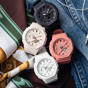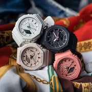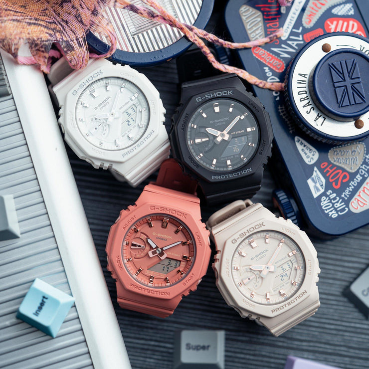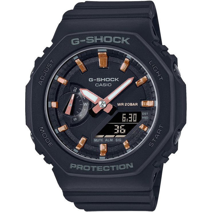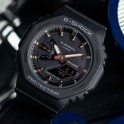 Slim, lightweight, compact watches with octagonal bezels and a monochromatic look. The new GMAS2100 series downsizes the popular GA2100 to create a simple and slim design. The octagonal bezel, flat face, simple bar hour markers, and carbon core guard structure that are distinctive features of the GA2100 are now available in a compact configuration. The GMAS2100-1A sports a classic black colorway with rose gold accents.