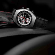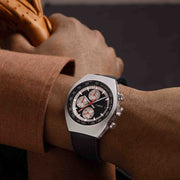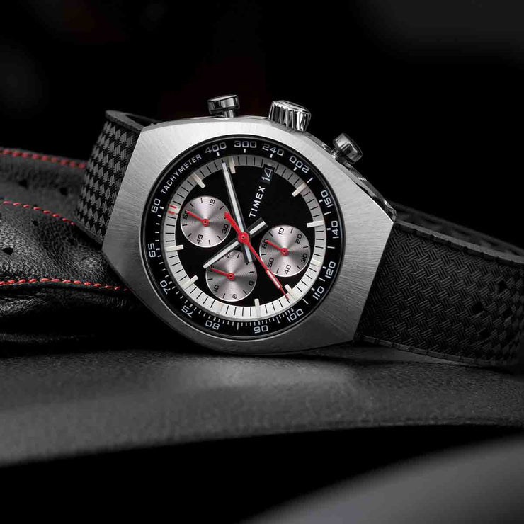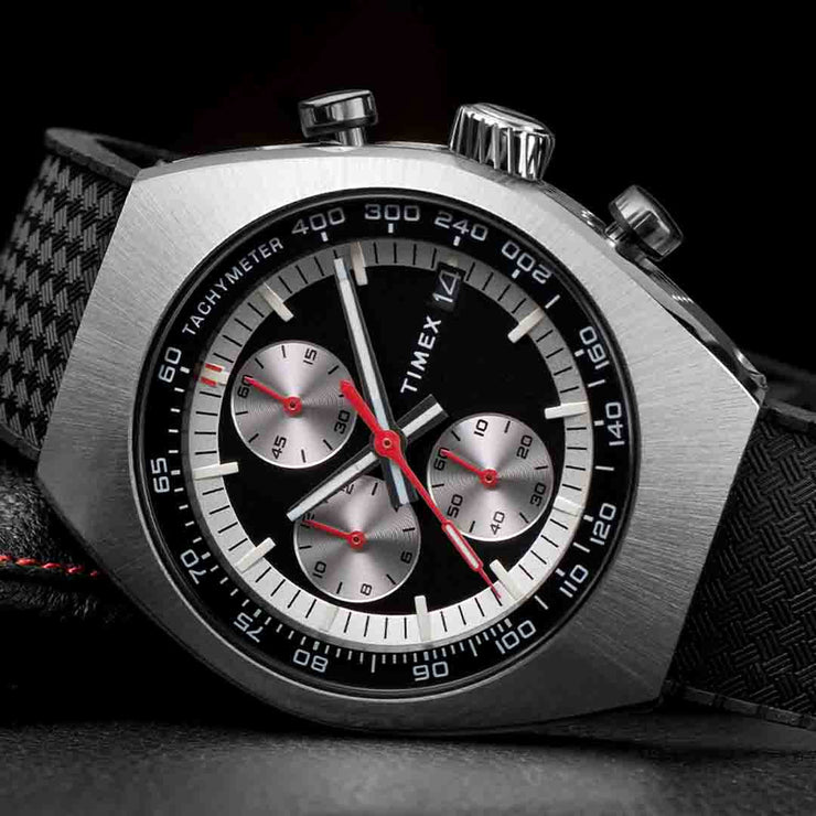 Designed to be visually striking, the Timex Legacy Tonneau Chronograph draws inspiration from the iconic watch styles of the ‘70s. Its sizable 42mm barrel-shaped stainless-steel case houses an elaborate, multi-layered dial with a date window beside the 3 o’clock mark. Sunburst brushing on the top of the case and intricate detailing on the case, crown, and pushers bring this polished timepiece even more sophistication, while bright red hands and a black synthetic rubber strap give it a sportier edge.