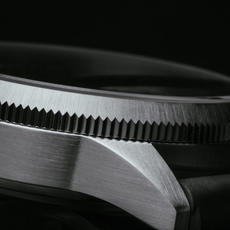 Finishing: Radial Brushed Bezel. Polished Knurls. Vertical Brushed Side. Circular Brushed Caseback