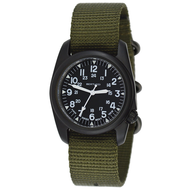 The A-2S Vintage Black™ vintage inspired dial is painstakingly authentic and functional. Utilizing our legendary U.S. Patented Unibody™ 40 mm case for unmatched comfort and durability... with a black PVD finish. Additionally, equipped with highly reliable and accurate Swiss movement, a scratch resistant R-Type mineral crystal, 100M water resistance, Swiss super luminous hands & markers, rugged screw down crown & back, and our long lasting B-Type nylon webbing band.