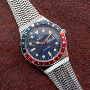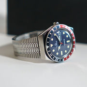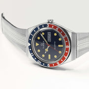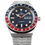 First released in 1979, the original diver-inspired Q Timex gave a new generation a modern Timex watch with quartz technology. A true reissue, Timex recreated every detail—including the true-to-the-era woven stainless-steel bracelet, functional battery hatch, rotating top ring, luminescent paint, and ticking inside is a modern quartz movement.