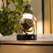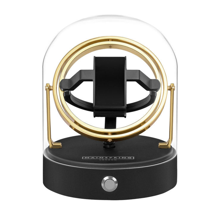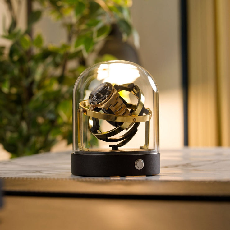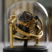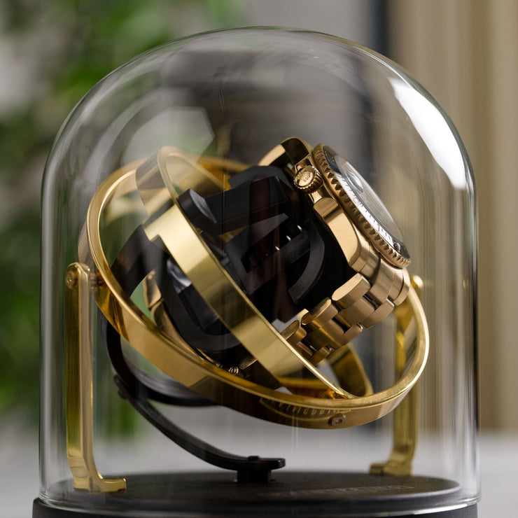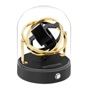 An almost mystical dance of metal around your timepiece, the Gyroscope echoes the motions of a tourbillon as it seamlessly winds your timepiece. This is no simple winder but an item of industrial wonder to behold on its own.
