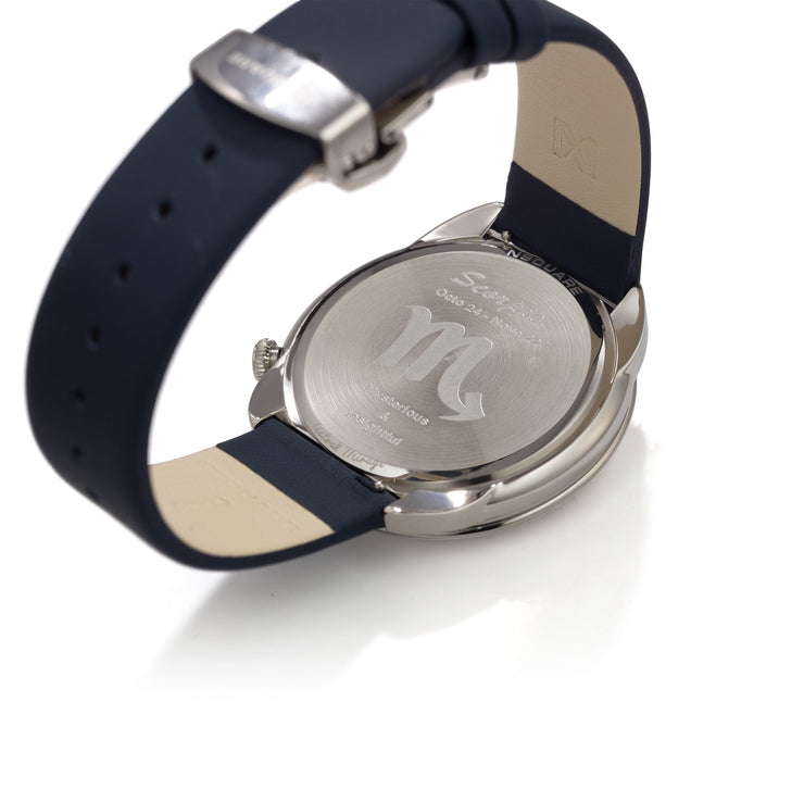 The Scorpio watch embodies the spirit of the loyal scorpion, guarding the night while fearlessly pursuing truth and power. The dial features the Scorpio constellation, linked by white stars, each adorned with radiant crystals that enhance its visual allure. A detailed image of the Scorpio is etched on one side of the dial, set against a deep blue starry background, creating an enchanting cosmic ambiance. At the 12 o'clock position, a sub-dial displays hours and minutes, marked with "NSQUARE" and "Astral Mirage." The striking blue dial contrasts sharply with the silver case, complemented by a blue strap for a harmonious design. The lower part of the dial prominently features the word “Scorpio,” highlighting the zodiac sign.