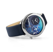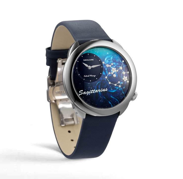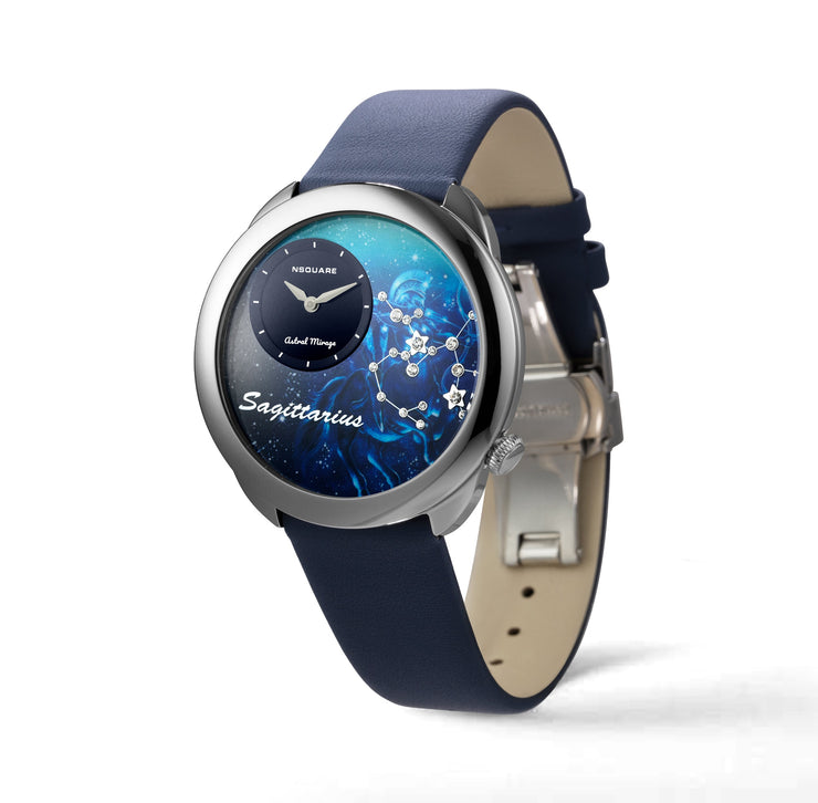 This watch features a striking design inspired by the Sagittarius zodiac. The dial showcases the Sagittarius constellation, linked by white stars and adorned with luminous crystals to enhance its visual appeal. A dynamic image of Sagittarius is etched on one side of the dial, set against a deep blue starry background for a captivating cosmic effect. At the 12 o'clock position, a sub-dial displays hours and minutes, marked with "NSQUARE" and "Astral Mirage." The blue dial contrasts beautifully with the silver case, while the blue strap completes the harmonious design. The lower part of the dial prominently features the word "Sagittarius," emphasizing the zodiac sign.