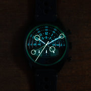 The Halograph III Chrono tells time using our signature split display, which we argue is easier to tell the time than a traditional clock. Simply read the time inside each circle at the top of the watch. The inner circle shows the hour, and the outer circle shows the minutes. And when the lights go out, the Swiss SuperLumiNova transforms the time-telling into that of a clock with a traditional hour and minute hand.