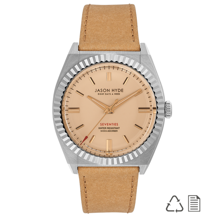 The Jason Hyde #AMBER 40MM Watch offers a warm and classic aesthetic with a beige dial and matching strap, powered by reliable Japanese movement. Featuring a 40mm Stainless Steel case, this watch is both durable and stylish. With a water resistance of 5 ATM (50 meters), it's suitable for everyday wear. This timeless timepiece is a perfect blend of understated elegance and functionality.