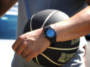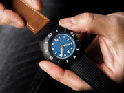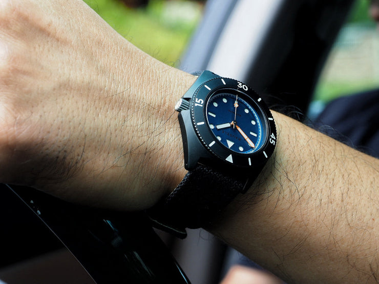 The tranquil beauty of the sun’s final descent as the sky shifts into deep blue hues, mirroring the vast ocean below. The black case represents the fading light, while the blue dial echoes the serene twilight over the reef, where the sea and sky meet in harmony. With a crown filled with sand from Manly Beach, this watch pays homage to the peaceful twilight moments, where the day’s last light fades into the cool embrace of the night.