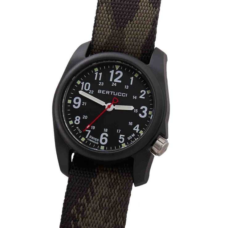 The DX3® CAMO™ Series features our legendary U.S. Patented A-2 Unibody™ 40 mm fiber reinforced polycarbonate case. Equipped with authentic U.S. Military, Made in USA, 2-PLY camo webbing. The U.S. Patented band is made from a unique webbing construction that offers unmatched comfort and durability. Additionally, packed with performance features such as precise and reliable all-metal movement, 4 year battery life, 50 M water resistance, Swiss super luminous hands & markers, solid stainless steel crown, case back and band hardware, and scratch resistant R-Type mineral glass crystal.
