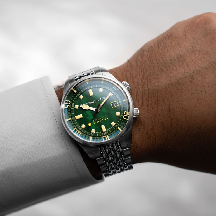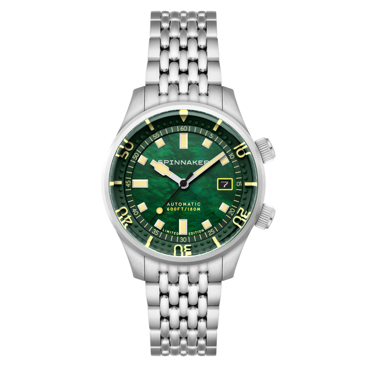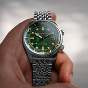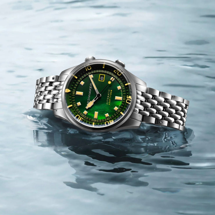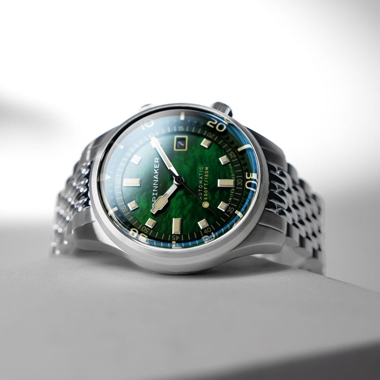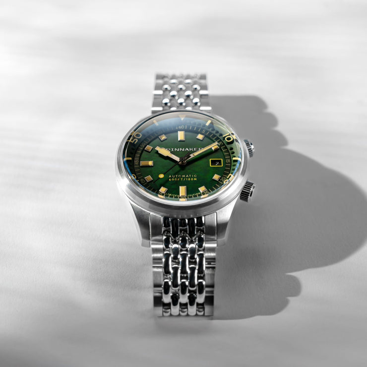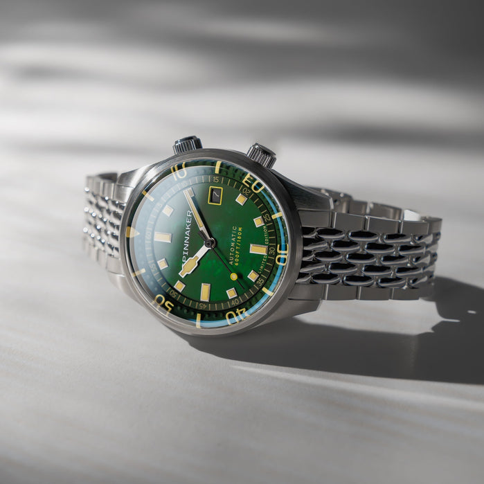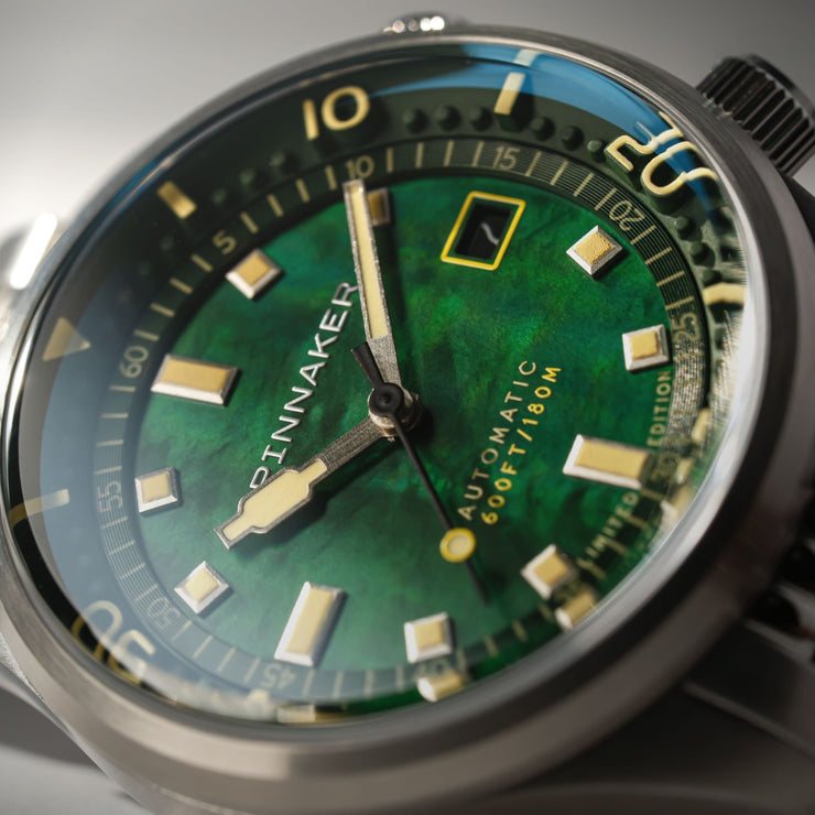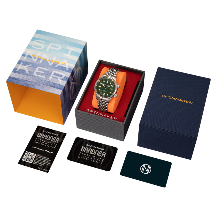 This collection showcases the timeless beauty of Mother of Pearl dials in three distinct hues: pearl, indigo, and emerald, capturing the allure of marine treasures. A true fusion of aesthetic refinement and functional precision, the Bradner Pearl Diver is a collector’s timepiece.
