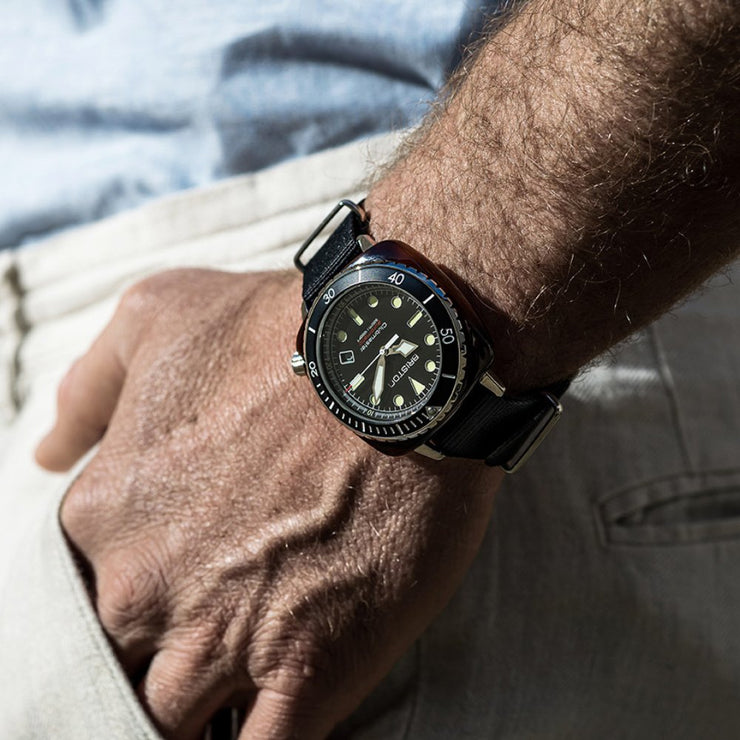 Exclusive Briston NATO strap in water-resistant black or navy blue nylon.
