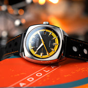 Experience racing of the older days with the Buxton Automatic. with a 38mm stainless steel cushion case, this compact timepiece is powered by a reliable NH35 automatic movement. The color combinations on the dial originate from classic racing cars, adding a touch of vintage hue to your everyday style. This is a sturdy and stylish timepiece that will surely elevate your timekeeping game.
