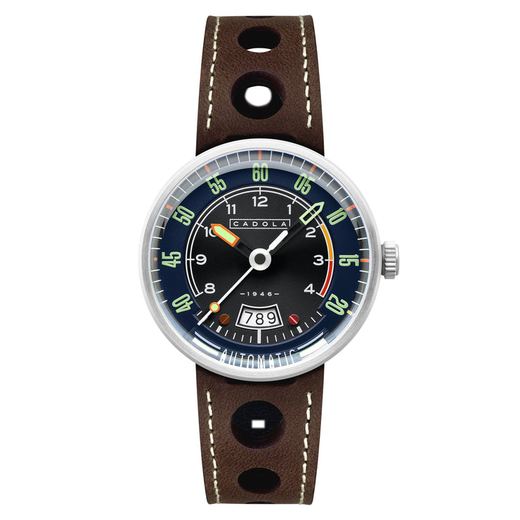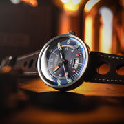Keep Up To Speed With Style And Elegance. The Rpm Automatic Is Powered By The Reliable TMI Nh35 Automatic Movement. The Dial Design Of This Timepiece Resembles Tachometer On Vehicles, Which Is Paired With A Brass Surface That Exudes Captivating Shades Of Colours. This Timepiece Is Completed With A Genuine Leather Strap With Perforated Design For A Touch Of Racing Style.