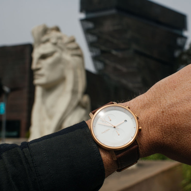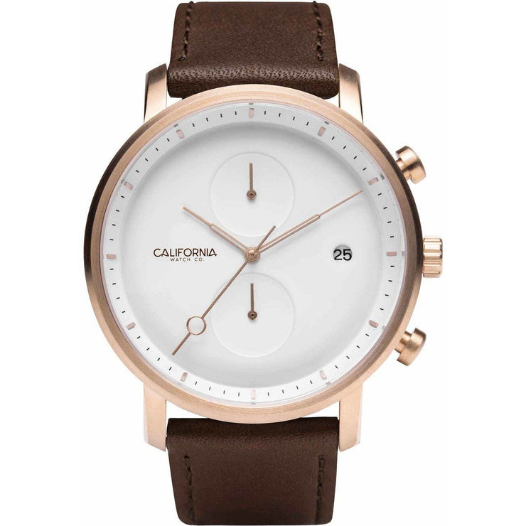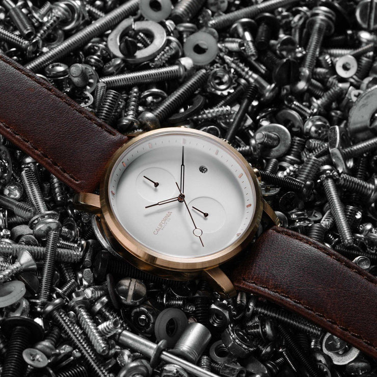 The Golden Gate Bridge is an iconic symbol of modern innovation and progress. The Golden Gate Chrono is a clean modern design that features a domed dial sloping up to the center of the watch. The subdials cut down into the domed surface, resulting in a minimalist chronograph. Built-in quick release springbar system allows you to effortlessly swap out straps if you want to change up your look.