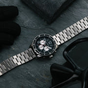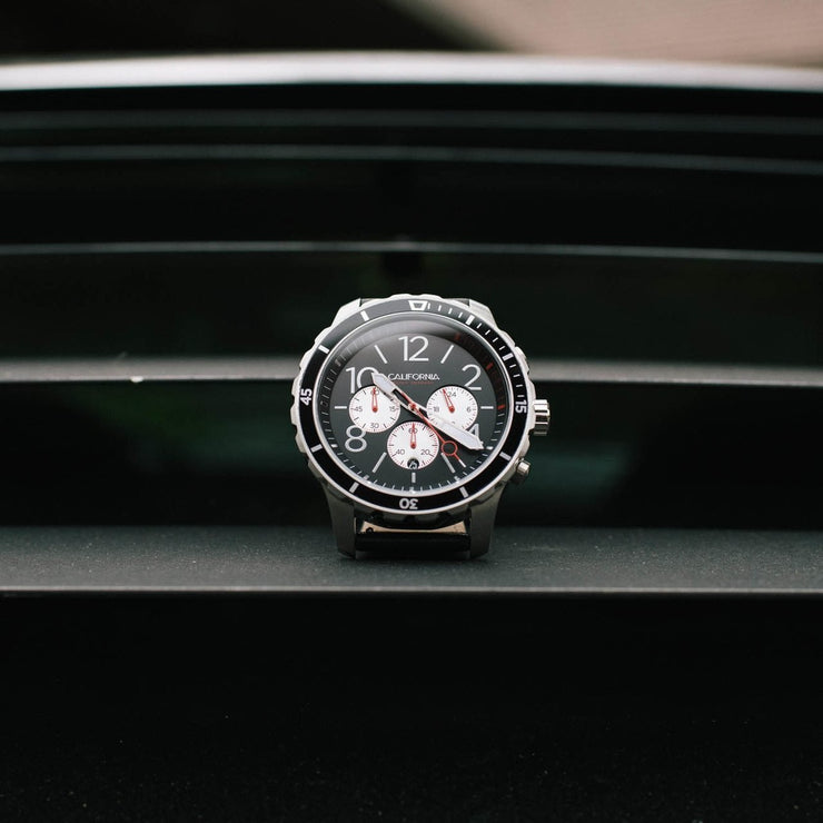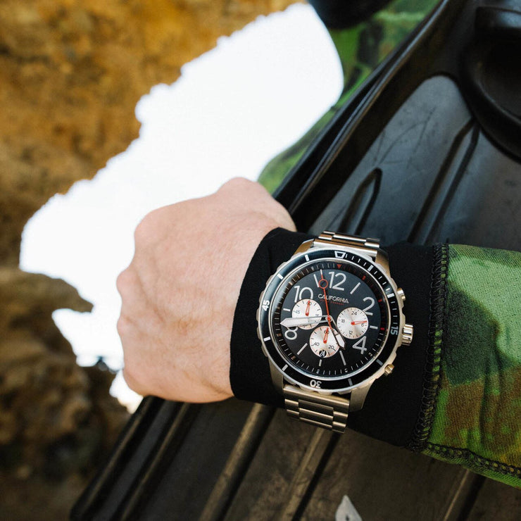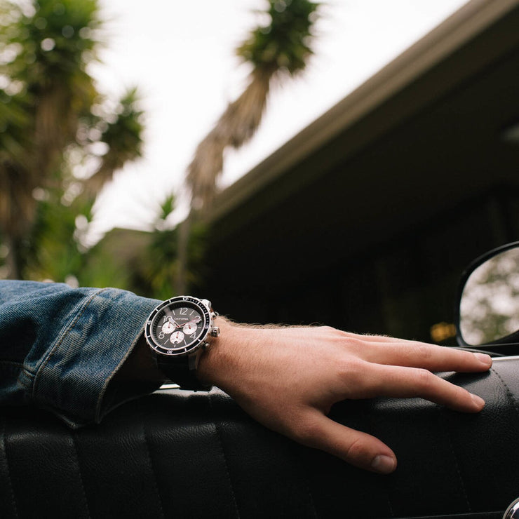 Mavericks is home to the biggest, most powerful wave on the west coast. The Mavericks Collection defines tough, with bold numerals, a unidirectional rotating bezel and a 60 minute chronograph. The watch is water resistant to 10 ATM, and features lume hands that make it ultra-legible whether you're out at night or doing a deep dive. Built-in quick release springbar system allows you to effortlessly swap out straps if you want to change up your look.