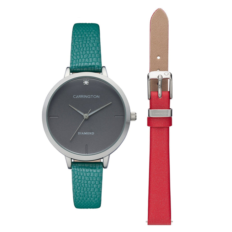 Adorn your wrist with the Claire collection. The minimal watch face features a sandblasted dial, which gives a textured surface in a pastel palette. With a single stone at 12 o'clock position, this timepiece is clean, airy, yet subtly elegant.