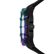 Diesel's 51mm Framed watch features a black matte dial with iridescent crystal, three-hand movement and black silicone strap.