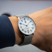 The Bayer Automatic Swiss impresses with its typical German dial design. It carries the typical Bauhaus heritage and can be found in earl watch design from the last century. The original design reaches back to the 1930's, a time when the Bauhaus modernism was in its heyday. Fine typography and hands are supported by slightly different levels on the dial. This makes the watch easy to read, without having big hands or indices. The small date window at 6 o'clock completes the design. The fine Milanese mesh strap fits perfectly on the watch case with its curved end-links and the pure white dial completes the excellence.