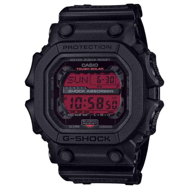 Go bold, tough, and intense, with the G-SHOCK black and red collection. The vibrant, high saturation red of the LCD really pops against the black bezel and band, not only enhancing visibility but also pushing the envelope of daring design. Activate the backlight to light up the digital display for even better visibility. Make a unique statement in all black, with a touch of bold red.