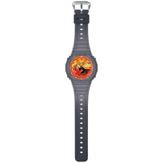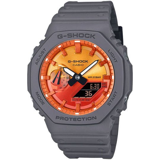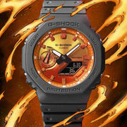 Fiery and bold G-SHOCK watches glowing with flames of awesome colour. G-SHOCK is all about taking on challenges, and the vivid colourful gradation of the Flame Inside line puts this blazing passion front and center. Beginning with the GA100 with distinctive large case and the GA2100 with octagonal case, the design brings in motifs of billowing smoke for the band and features a brightly burning dial in flames of blues or oranges. Choose your favourite look — the GA100FL-1A or GA2100FL-1A with vivid blue dial and gradated gray-on-black body, representing the hottest flames of conviction against rising white plumes of smoke; or the GA100FL-8A or GA2100FL-8A with bold orange dial and gradated black-on-gray body, evoking flames of fiery passion against a dark smokey backdrop.