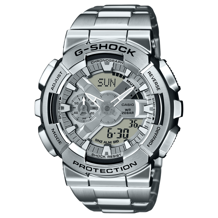 From G-SHOCK, the toughness watches that are ever evolving in an endless pursuit of strength, the GM-110 series is based on the digital-analog display combination GA-110 model of the rigid and fashionable stainless steel bezel. The dial has a characteristic Y-shaped part that retains the texture of the metal, and the digital display and hour and minute hands are arranged in a well balanced manner to improve visibility.