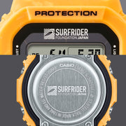 Oneness with nature in the sunrise surf. Strap on a G-SHOCK-Surfrider Foundation Japan collaboration watch designed for surf enthusiasts and extreme sports fans. Sharing a passion for the environment, G-SHOCK is proud to team up with the Surfrider Foundation Japan and its core mission of protecting the marine environment. Inspired by the sunrise surf, the watch captures the serene beauty and warm glow of a beach bathed in morning sunlight. This singular moment is expressed in a variegated blend of harmonious yellow and beige tones.