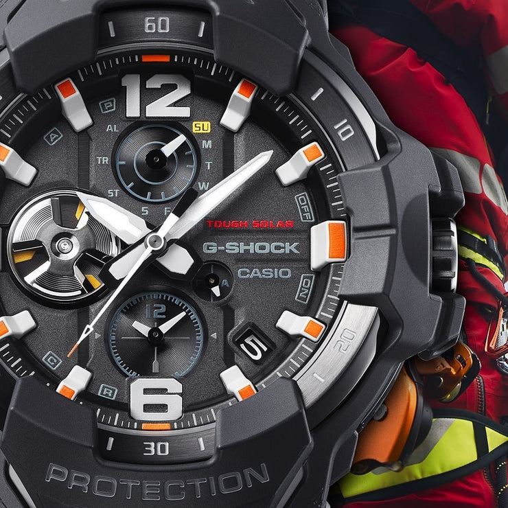 Whatever you’re doing, wherever you are — the G-SHOCK Master of G line has your back. Based on GRAVITYMASTER, MUDMASTER, and MUDMAN models that deliver peak performance in punishing conditions in the air and on land, this line features a black watch case symbolizing toughness, with accents in vivid emergency colors that capture the world of professionals involved in rescue efforts and other critical missions. The organic form of the GRAVITYMASTER GR-B300EC is inspired by next-generation aircraft and rendered with a seamless exterior design. The Carbon Core Guard structure and wide 3D face deliver durability, readability, and a comfortable fit. Enjoy all the practical functions as well, including dual-time simultaneously showing the time in two cities, a flight log memory function for recording routes traveled, and more.