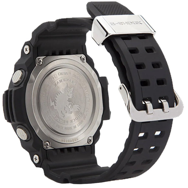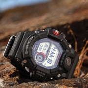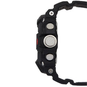 All of this plus sunrise/sunset data, one-touch time recording, one-touch elapsed time measurement, world-renowned G-Shock toughness and durability, and much more makes RANGEMAN the perfect choice for rangers, rescue crews, and anyone else whose profession or activities demand unfailing reliability. Black resin band digital watch with black face, red accents on the dial and the side button.