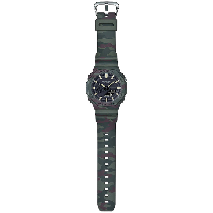 From the toughness-driven G-SHOCK, a design inspired by adventurers whose love of the wilderness knows no bounds. Switch between interchangeable bands and bezels for a thin octagonal GAE-2100 with an even wilder spirit. Green nature-inspired camouflage and vibrant outdoor-fashion orange take you from fashionable urban streets to wilderness exploration in cool, casual style.