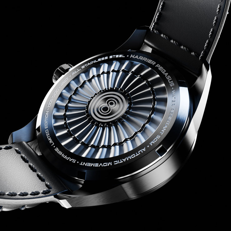 A striking tribute to the legendary Rolls-Royce Pegasus engine, a marvel of engineering capable of vertical takeoffs, precise hovering, and rapid forward manoeuvres. This limited edition echoes that story with every detail—its custom subdial echoes the Pegasus turbine’s raw power, to the all-black case, every element is crafted for those ready to rise and soar.