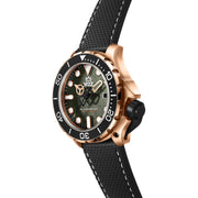M2Z DIVER 200 is an Italian designed watch made of a single block of 316L steel which makes it resistant up to 200 meters deep. The strap, equipped with a quick release mechanism, is made of hypoallergenic polymer (FKM) used in the aerospace industry for its high resistance to ultraviolet rays and chemical agents and oxidants attacks. The dial has applied indexes and luminescent spheres is decorated with a wavy texture in relief. Another interesting element is the anodized aluminum crown guard that protects the screw closure with double gasket from any impact or collision. The beating heart of this generously sized (46 mm) timepiece is a TMI NH35 automatic movement.