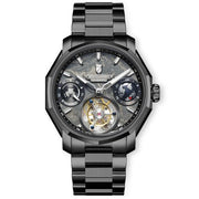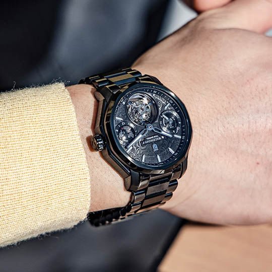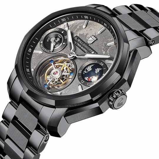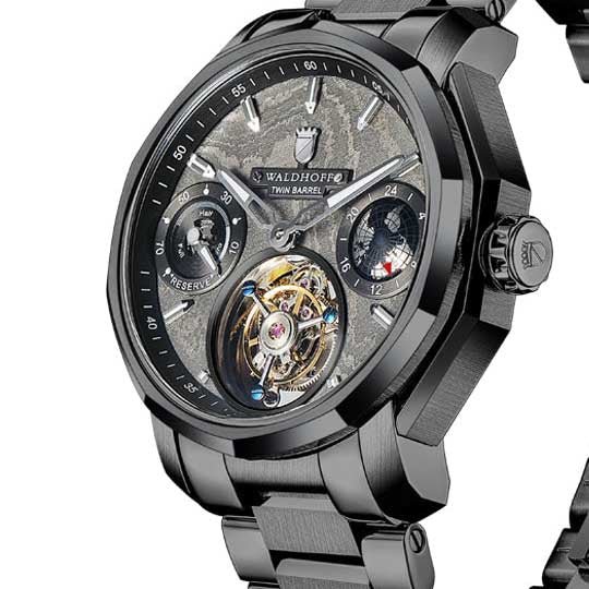 The Waldhoff Continental was designed to be a balance of classic and sportiness. It features and intricate multifunction tourbillon movement with a power reserve and 24 hour indicator, a bespoke Damascus steel dial and a sporty stainless steel body. Its front is keeping things simple for the sake of readability, but the backside reveals the beautifully detailed movement under a Swiss sapphire crystal.