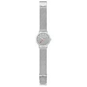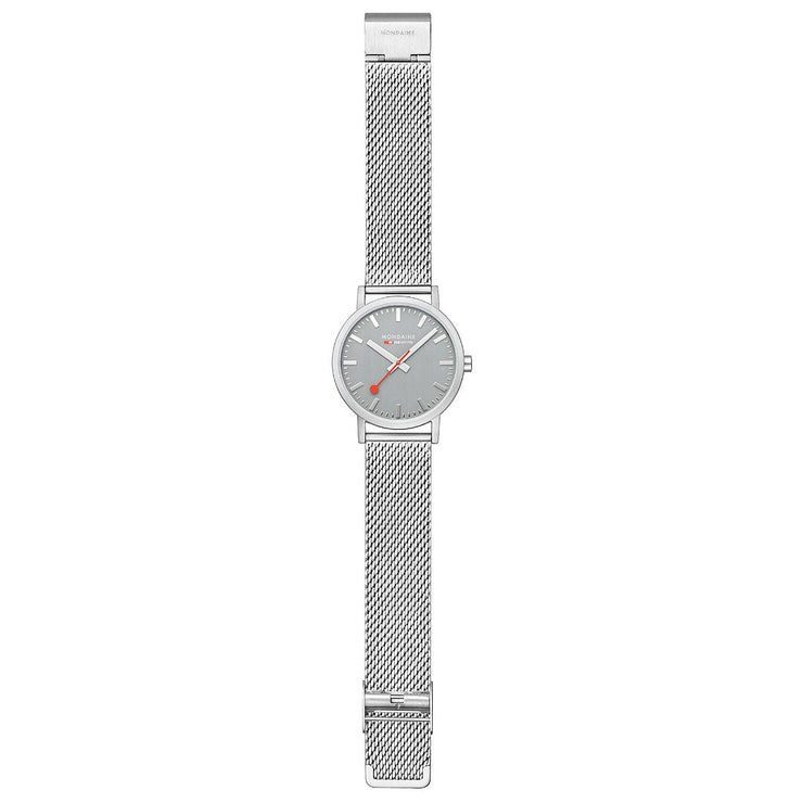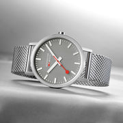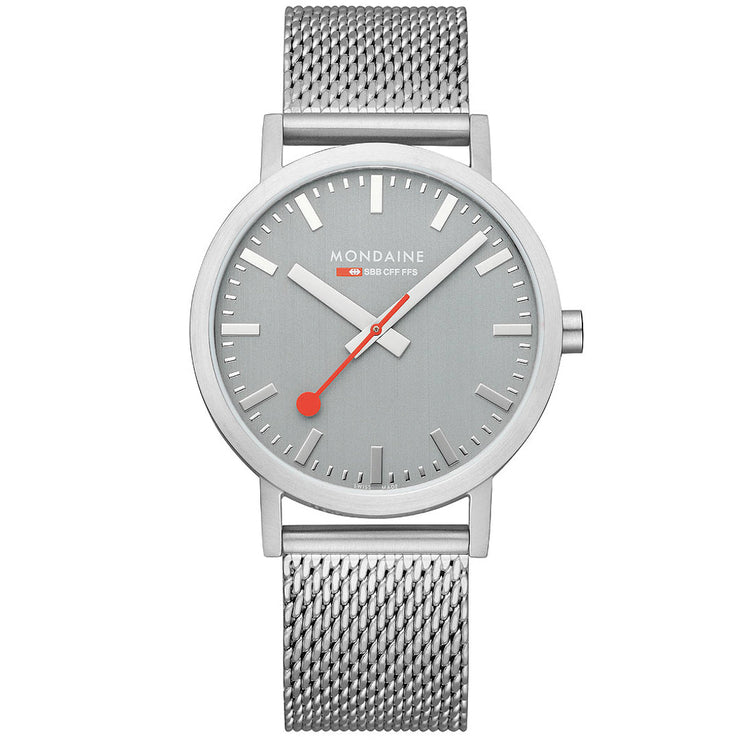 This Classic collection watch showcases a 40mm tone-on-tone stainless steel case, hands and markers with a matte finish to maintain the timeless design and minimalistic look of Mondaine. Featuring a Good grey dial and a stainless steel Milanese mesh band, this timepiece pays tribute to the greatness of our Swiss Alps. Our Classic Collection comes with a clever quick-change system, allowing you to easily change your straps.