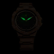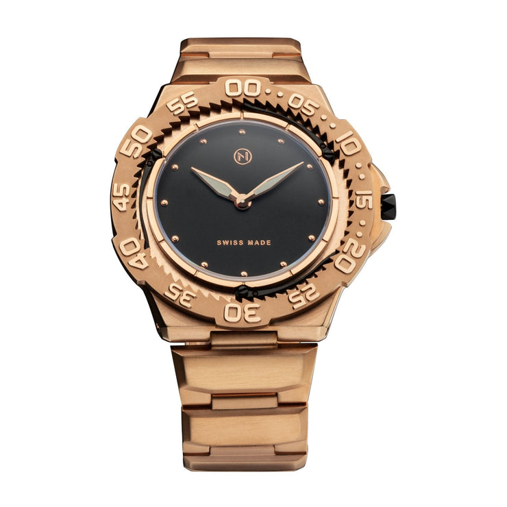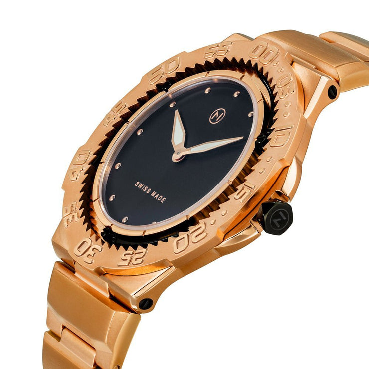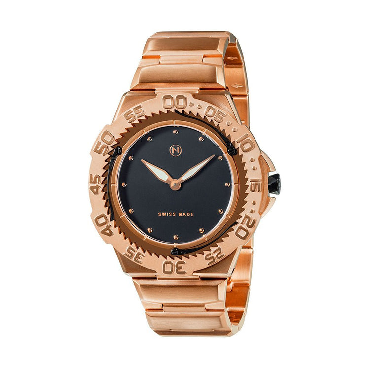 The NOVE Trident is the world’s slimmest diver watch, boasting a staggering 6.8 mm thickness with 200/660ft water resistance. The unique 3-lever stopper system is precisely engineered to keep the bezel unidirectional, and can be easily cleaned after each dive. Swiss made quartz powers the Trident, and scratch-resistant Sapphire crystal ensures real world use when you’re out on the ocean. Perfectly stylish for board meetings or lavish balls, the Trident is a functional phenomenon. Made in Switzerland