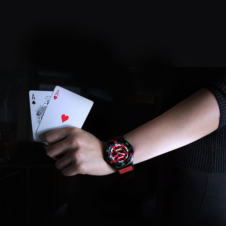 The Casino Royale wristwatch boasts a newly designed 45mm case, offering a streamlined, compact shape that provides both a striking and comfortable fit. The design cleverly incorporates the world of poker into the watch, with playing cards and chips seamlessly integrated into the dial. The cards are meticulously engraved with a sleek, embossed technique, revealing a visible movement that highlights the watch's craftsmanship. The time markers are represented by poker chips and symbols, perfectly complementing the intricate poker card design. This watch is sure to captivate both watch lovers and poker enthusiasts at first glance.