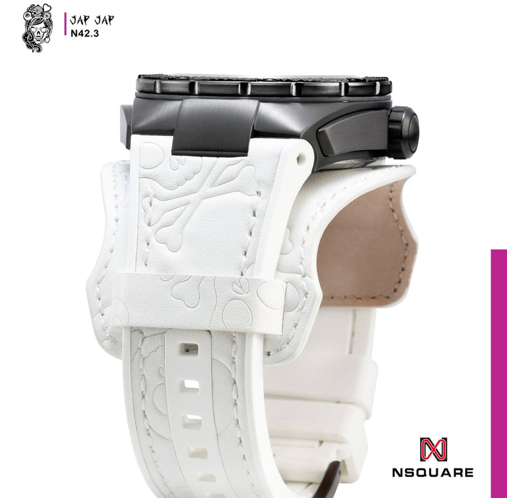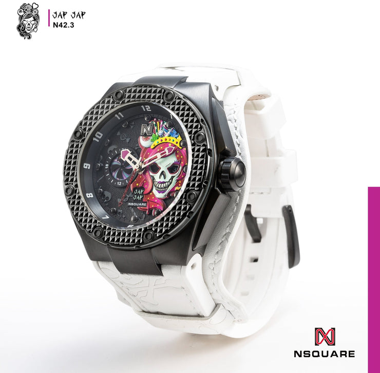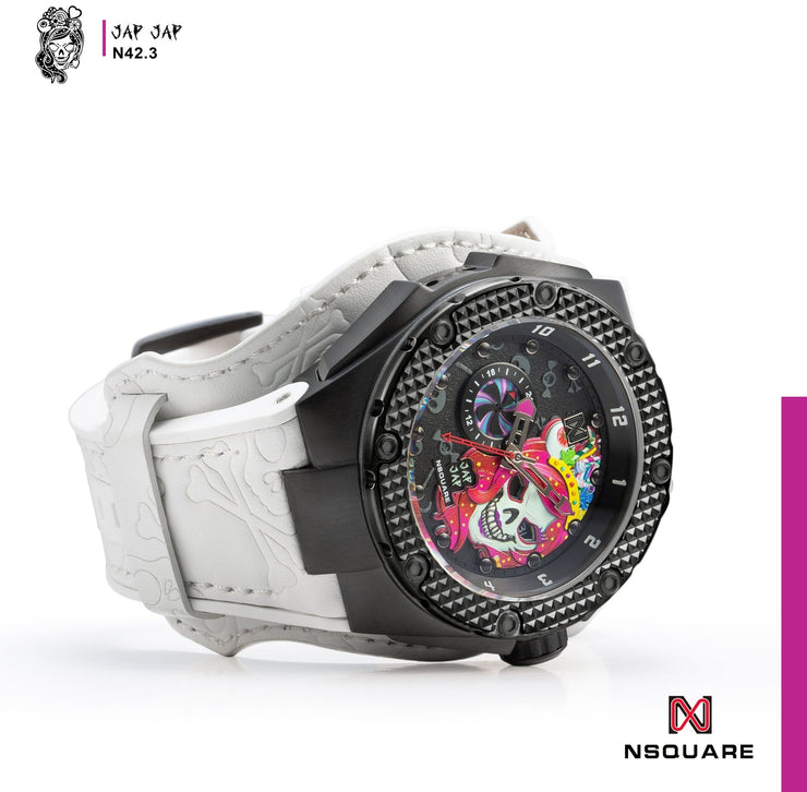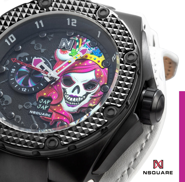 The new Jap Jap series is inspired by candy 🍬, featuring bold, eye-catching colors that are as irresistible as the sweets themselves. The dial of the Jap Jap series showcases special designs of Mr. Jap Jap and Miss Jap Jap, created by NSquare's designer. With a multi-layered, three-dimensional design and a large 46mm stainless steel case, this watch fully embraces its candy-inspired theme, taking the already unique Jap Jap to the next level. The strap is crafted from intricately embossed Jap Jap leather, and the watch is powered by the Miyota automatic movement, bringing a rush of excitement to your style. Stand out with a high-profile design that captures attention and reflects your exceptional taste.