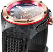 Case: 44mm diameter.Black Carbon fibre composite material. Stainless stain rose gold PVD crown with red detail.