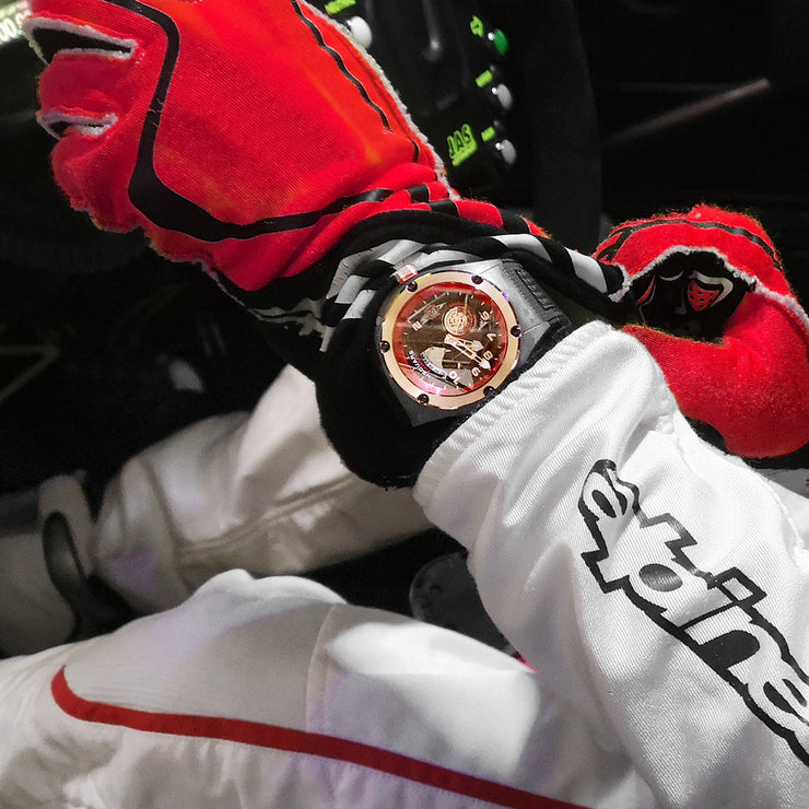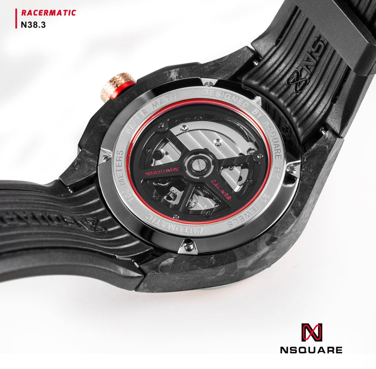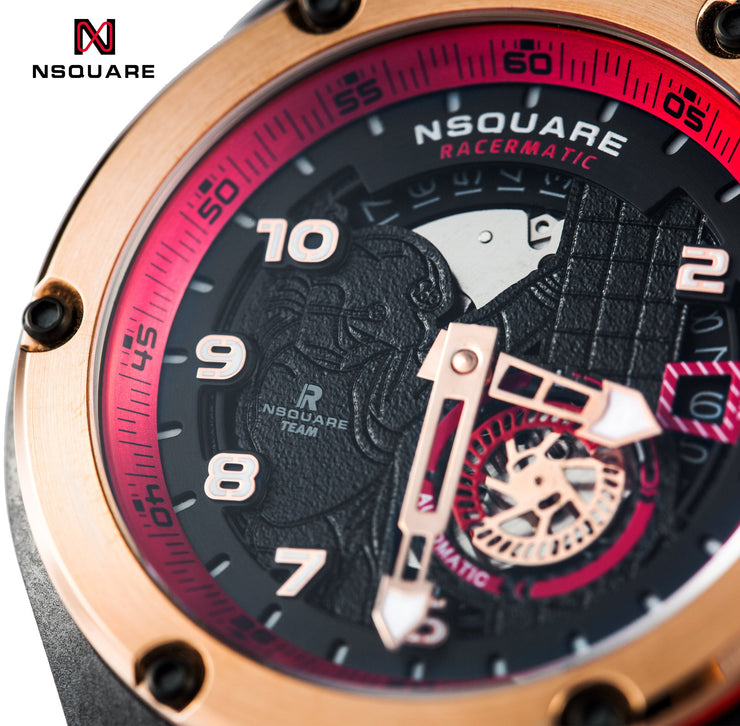 The Racermatic series features a 44mm carbon fiber composite case, combining lightweight durability with a design tailored to meet the needs of professional racers. Its sleek and dynamic form reflects the spirit of motorsport, showcasing NSQUARE's commitment to pushing boundaries with each new design. The dial embodies the essence of racing, capturing the triumphant moment when a racer celebrates victory with fans' cheers. With its innovative design and streamlined appearance, the Racermatic series is the perfect blend of style and performance.