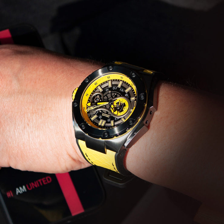 Strap: Dual materials: Yellow Python snake embossing pattern leather with black rubber strap.