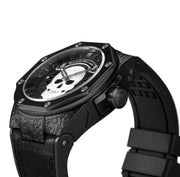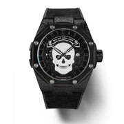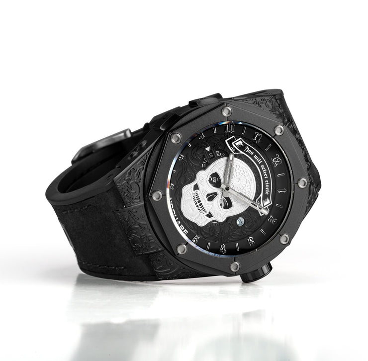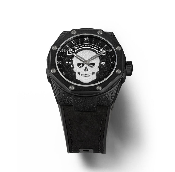 Dial: Black. Applique silver skull. Skeleton metal hour and minute hands filled with luminous.