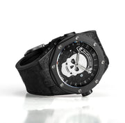 Case: 46 mm in diameter.Black color PVD coated stainless steel 316L case. With engraved pattern. Back with opening in Specially hardened mineral glass, centred on the balance.