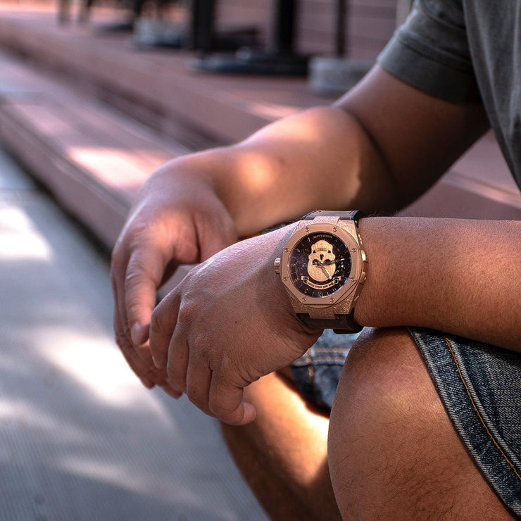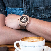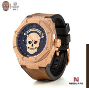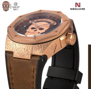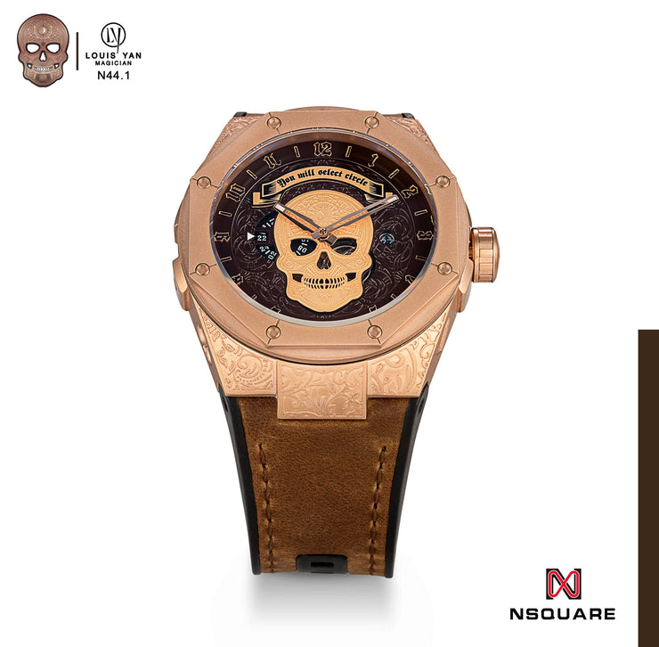 Dial: Brown. Applique Rose gold color skull. Skeleton metal Rose gold color hour and minute hands filled with luminous.